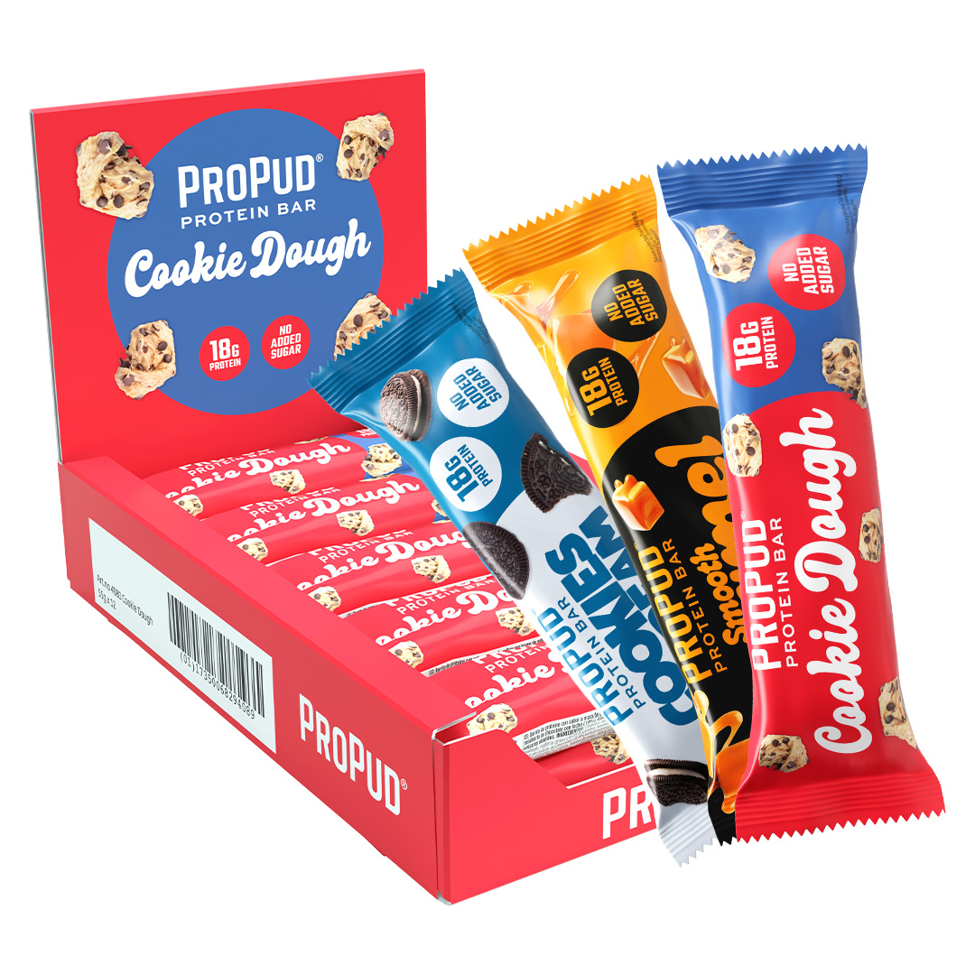 En god mellommåltid med opptil 18 g protein, helt uten tilsatt sukker. Finnes i flere forskjellige smaker og konsepter. ProPud har to forskjellige proteinbarer, en smooth-serie med fyldig smak og en cookie-serie med sprøhet av kjeks. Finn favoritten din her!